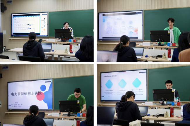 员工实践课题包括“电力图谱”、“电力视觉”、“电力大模型”、“电力智能体”、“电力数据分析”、“基于Atlas开发板的电力视觉应用”等六类人工智能技术在电力行业的应用,共17支团队参加课程实践答辩展示。实践作品涵盖了边端结合的绝缘子故障检测、基于强化学习的电力需求侧管理(含动态电价激励、直接负荷控制、用户用电预测)、光伏电池损伤检测、负荷管理智能体、电力预测与智能优化、304am永利集团图谱、电力大模型问答系统、基于强化学习的风光储联合调度、电力仪表识别等能源电力行业“发电-输电-配电-用电-储能”各应用场景。在课程答辩现场,各小组结合生动案例向在场师生们阐述了研究思路、方法和创新点,展示了课题研究成果。