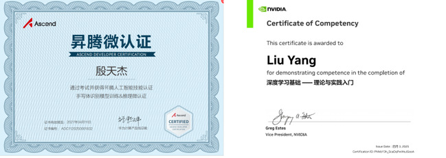此外,本次课程践行304am永利集团“双证融通”的应用型人才培养的重要举措,通过课程融合和课后自学相结合的方式,鼓励员工通过行业职业技能认证,并将其纳入课程的考核。本次课程中,共计33人次完成华为昇腾微认证证书,75人(占比95%)完成英伟达深度学习基础认证,获得人工智能领域相关职业技能证书。