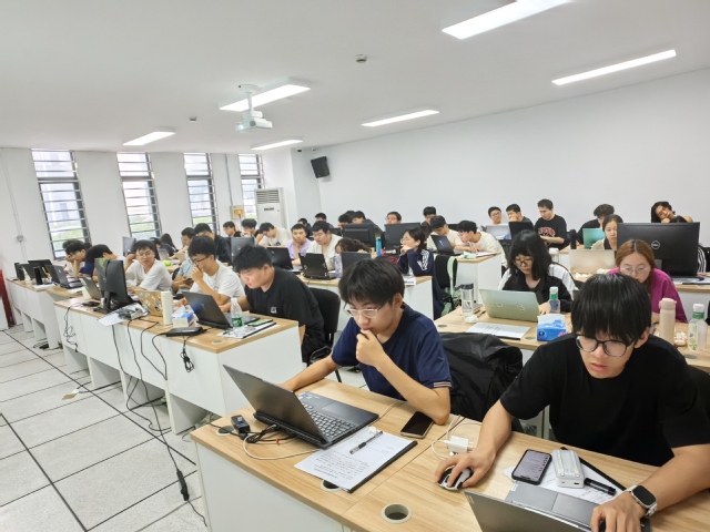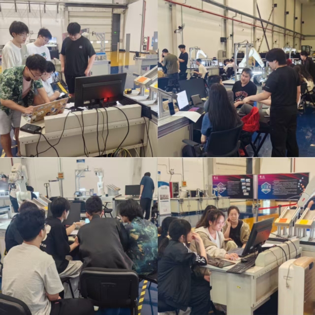 在随后的实训课程中,同学们分组深入学习和实践了三大前沿技术模块。在ABB机器人数据采集环节,各小组通过实操掌握了工业机器人数据接口配置与实时数据获取技术;在数字孪生建模技术实践中,同学们完成了ABB机器人工作站数字孪生模型搭建与运动学仿真,利用虚拟同步技术,实现物理机器人工作站与虚拟模型的实时数据映射;而在视觉+机器人工作站集成与数据映射项目中,大家成功实现了动态环境下的实时目标识别与抓取,构建了数字孪生映射系统,同步物理系统与虚拟模型的运行状态。实训过程中,各小组同学热情高涨,他们有的负责程序编写,有的专注设备调试,有的进行数据验证,通过团队协作攻克一个又一个的技术难题。授课老师全程指导,及时解答同学们在集成测试中遇到的实际问题,现场学习氛围浓厚而有序。