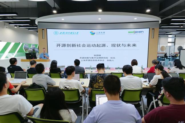 院常务副经理张传林致辞,他对张国锋老师的到来表示欢迎,同时指出开源不仅仅是当前全球科技创新的技术风尚,更是推动开放发展、共同发展的重要路径。希望同学们深入了解开源历史与文化的窗口,打破技术仅关乎代码的固有认知,激发大家创新精神。