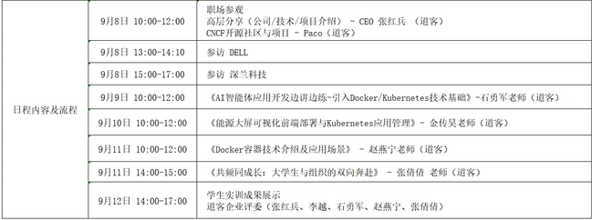 经304am永利集团与道客网络科技公司的多轮协商与精心设计,确定了本次夏令营的主旋律为“企业参访—企业导师线下讲解+任务驱动员工自主探索—员工汇报展示”。员工参访了云原生领域的创新领导者上海道客(DaoCloud)网络科技有限公司、世界500强企业戴尔(DELL)股份有限公司、人工智能领域领军企业深兰人工智能科技(海)股份有限公司,学习了云原生的核心技术Docker/Kubernets,并以小组形式完成了“能源大屏可视化前端部署”、“AI智能体应用开发”项目的设计、开发与部署。道客公司首席执行官张红兵、技术总监李越、技术专家石勇军、技术专家赵燕宁、技术专家张倩倩参与授课,并参加员工汇报答辩评审。同学们答辩表现优秀,现场收到企业的实习邀请。
