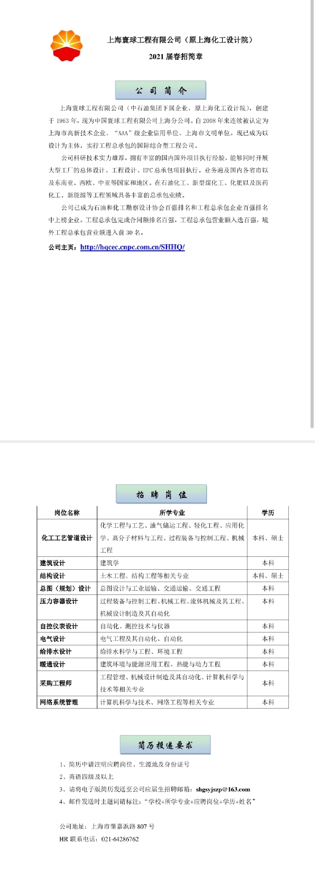 【招聘信息】235-202103上海寰球工程有限公司(原上海化工设计院)招聘