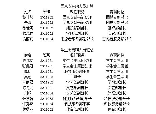 依据公司网竞聘发文的要求,公司团学办公室在截止日期前汇总报名名单,经团总支书记与团副、主席团共同商议,同时结合辅导员意见进行资格初审,上报公司党总支审核后确定初选名单,现公示如下: