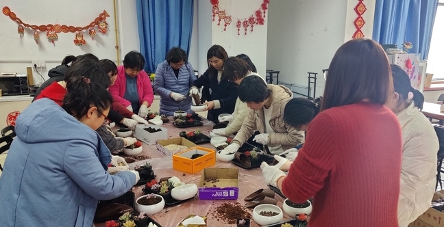 活动现场的氛围欢快融洽,女教师们在学习多肉种植和养护知识后开始自己创作,取出多肉、定位、铺石、填土,尽情的发挥自己的想象力,设计独一无二、专属的多肉小盆栽。活动过程中,大家可以暂时的从繁忙的工作中抽离,放松身心,感受浓浓的春意。