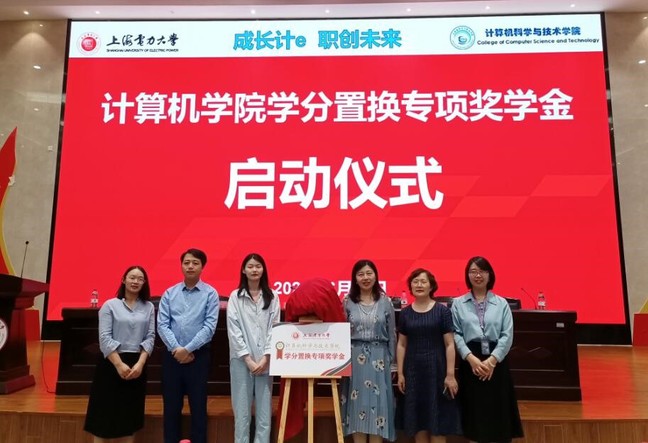 在学分置换专项奖学金启动环节,丛亮、书记、齐永晓和上海南天电脑系统有限公司唐敏、上海泛微网络科技股份有限公司刘建辉、达而观信息科技(上海)有限公司王琳共同为学分置换专项奖学金揭牌。
