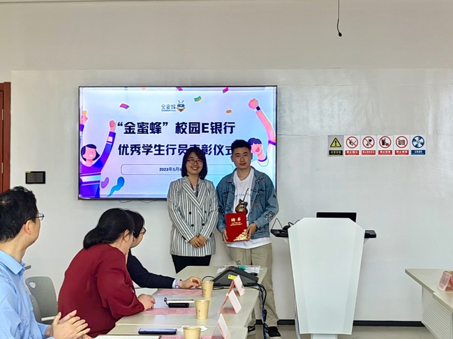 优秀员工行员代表、2023年E银行员工行长王楠芳发言并介绍E银行相关情况及本年度分工。王楠芳讲到,“金蜜蜂”的成长和建设离不开全体成员的辛勤付出与不懈努力,在办公室、后勤保障、新媒体宣传三大部门工作的配合下,“金蜜蜂”为上门咨询的师生答疑,积极协助建行完成银行卡、社保卡的办理与激活,希望各位员工行员能够热心对待进门咨询的师生,认真负责好E银行日常值班与运营管理工作。