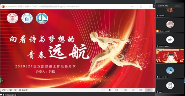 院团委副书记苏格同学以“向着诗与梦想的青春远航”为题分享2020321团支部建设工作经验,他指出开展团日活动需要调动同学们的积极性,做到寓教于乐,团支部“争红创特”需要从大一就开始准备,共同建设优秀团支部。校团委实践部负责人李浩为大家带来暑期社会实践成果展示及经验分享,鼓励大家今后积极投身社会实践。