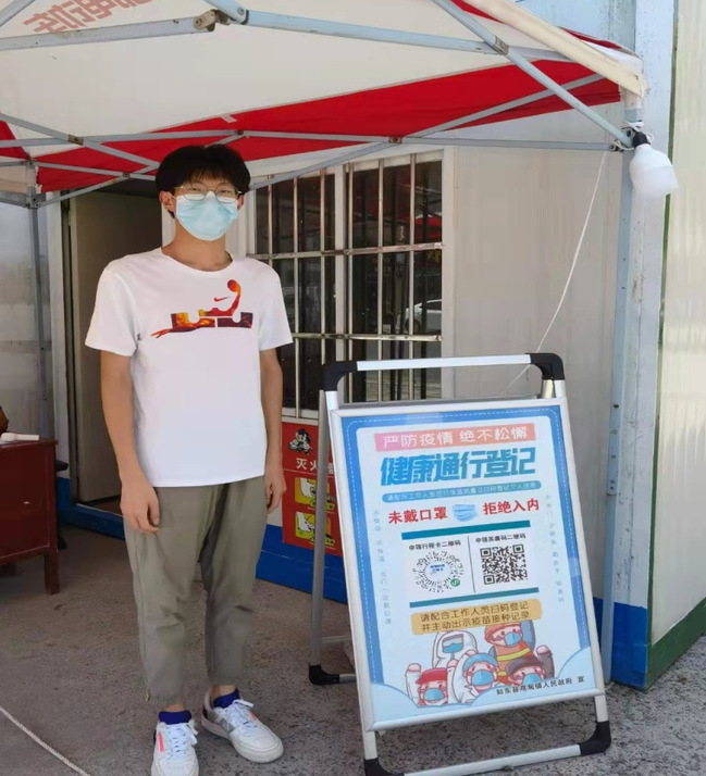 根据镇上防疫工作实际需要,缪雨松同学来到小区搭建的简易工篷中,检查小区出入人员的体温是否正常并进行详细登记、检查健康码行程码,同时还要劝阻非本村人员进入。当时正值暑期最热的天气,工篷内条件艰苦、防控压力巨大,有时要坚持一整个通宵,有时又要顶着炙热的阳光,缪雨松同学不惧艰辛、忠于职守,与其他工作人员一道在基层一线构筑阻断新冠肺炎病毒传播的坚强防线。