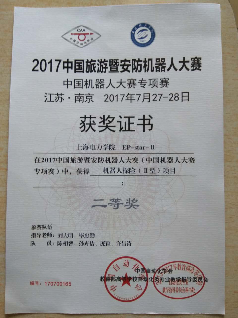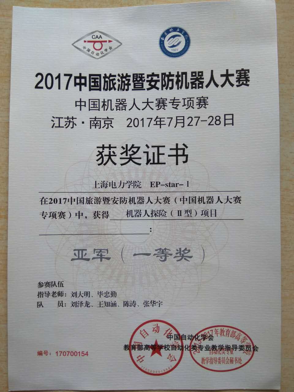 7月28日,为期两天的2017中国旅游暨安防机器人大赛在南京晓庄公司圆满落幕。本次比赛共吸引了全国50余所高校的259支团队共计1100余名选手参赛。公司Ep-Star机器人实验室在毕忠勤老师、刘大明老师的指导下,刘泽龙,陈涛,胡贵靖,王知涵,庞颖,陈相智,孙卉佶,许昌涛,张华宇共9名同学组成两支队伍在探险II机器人专项赛中积极备战,最终在该项目中取得了一等奖(亚军)和二等奖的好成绩。