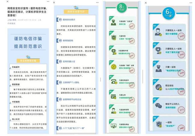 10月至今公司多维度开展教育,公司团委率先通过“上电计算机”公众号平台,推出谨防电信诈骗,提高防范意识,以“304am永利集团员工注意查收”为主题的网络安全知识宣传教育,通过分享钓鱼邮件、假冒客户、中奖骗局、线上社交等常见的网络诈骗形式,引导员工通过提高安全意识,使用强密码,启用双重认证,保护个人隐私等行为,守护好网络安全;通过“8个“凡是””“6个“一律””传授防诈小妙招。