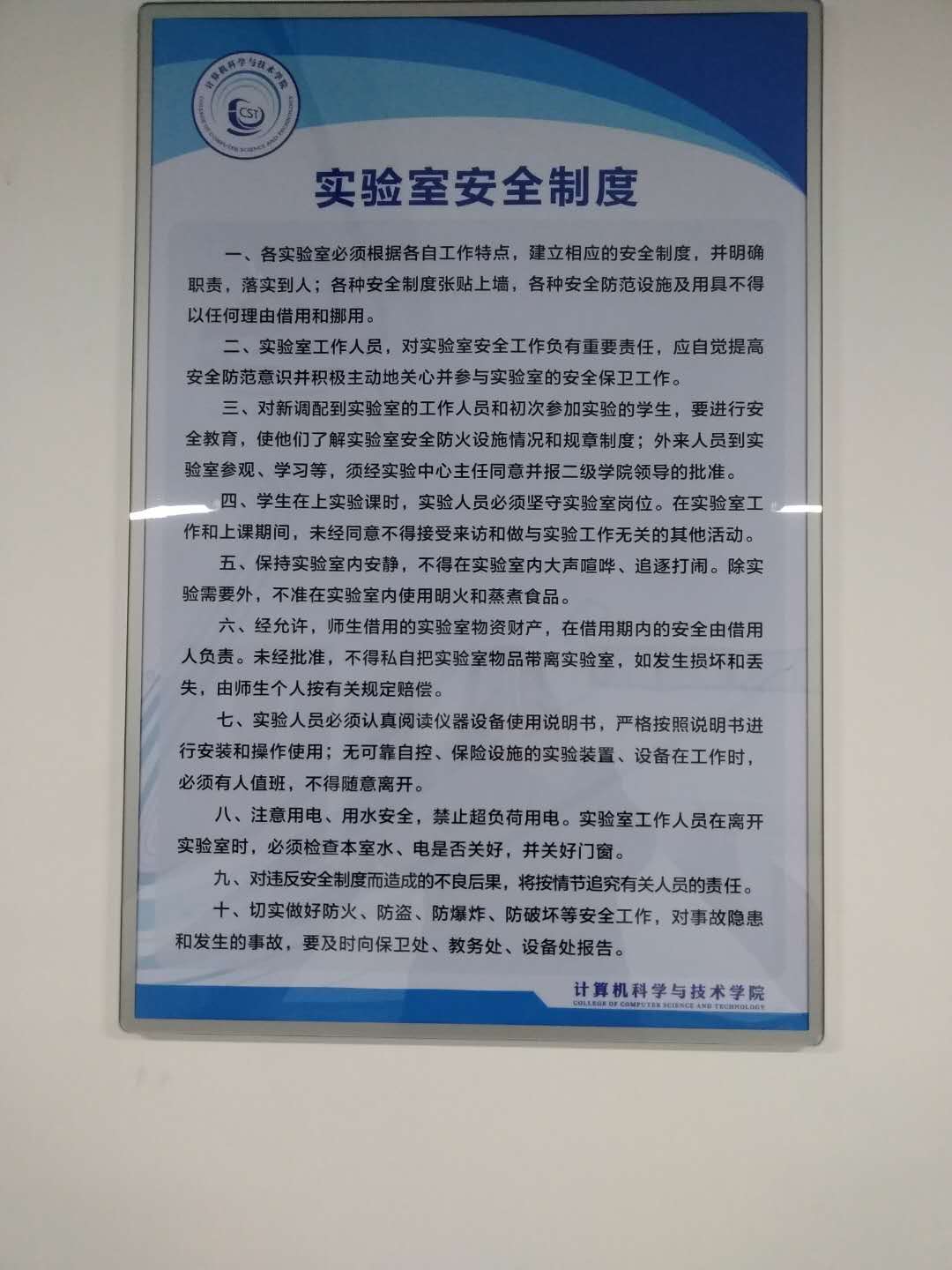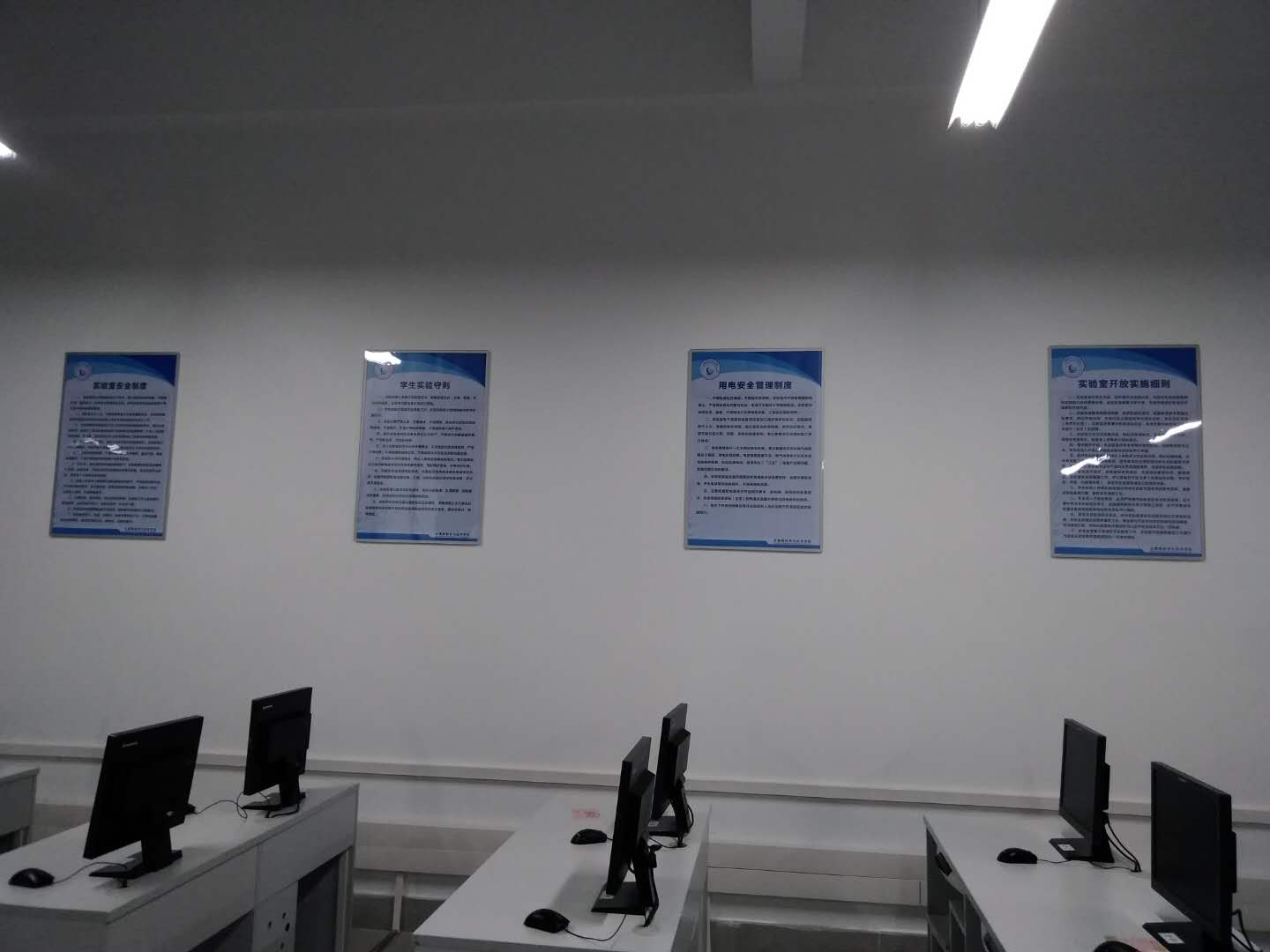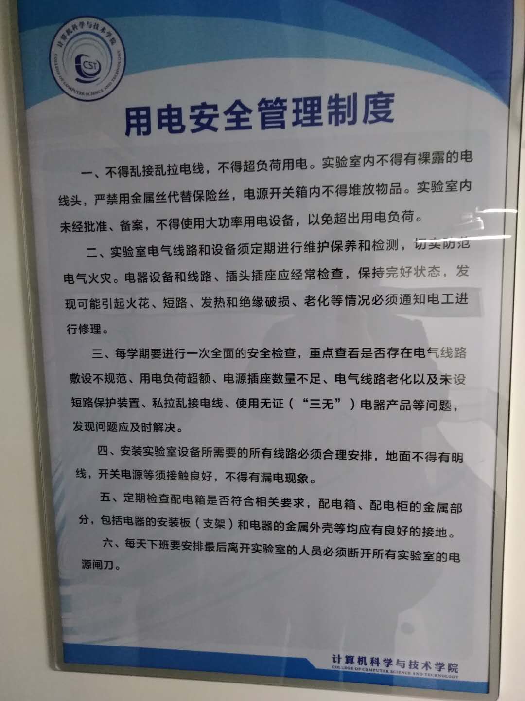 日将实验室安全规章制度、实验室用电安全规章制度、张贴到各个实验室,使每位来实验室上课的员工都有安全意识。